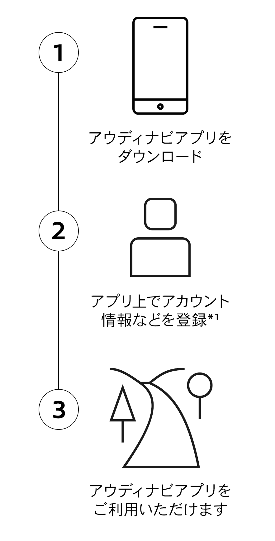 アウディナビアプリをダウンロードし、アプリ内でアウディナビアプリIDのアカウントを作成して必要な情報を登録するだけで、すぐにご利用いただけます。