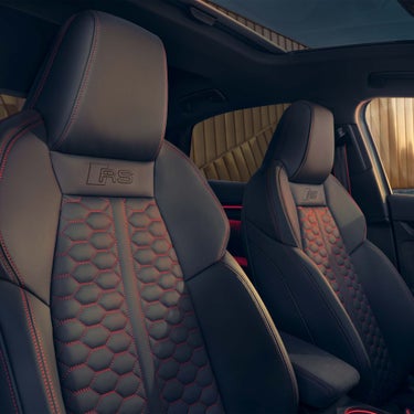 機能的でドライバーオリエンテッドなスポーティなコックピットと仕立ての良い上質でハイセンスな空間の融合。ステアリングホイールのAudi rings、ドアレバー、各種ボタンなど各部をバナジウムルックで仕立て、空間全体をダークな色調で包み込みます。上下をフラットとしたダブルフラットシェイプデザインのステアリングは手に馴染むように握りやすく、鋭いコーナーでも俊敏な機動性を遺憾なく発揮。さらにRSモードに素早く切り替え可能なサテライトスイッチ、シフトインディケーターを備えたRS専用のバーチャルコックピットプラスを搭載するなど、スポーティさとプレミアム性が両立する空間が走りへの集中力を高めます。