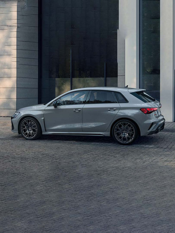 走るたびに表情を変える立体的なドアパネルや専用サイドスカート、大きく張り出し存在を主張するブリスターフェンダーが、Audi RS 3のサイドビューをよりダイナミックに演出します。サイドエアベントはモータースポーツで使われるデザインを応用することで、本格の走りを体現するエクステリアへと昇華しています。