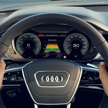 高解像度12.3インチカラー液晶フルデジタルディスプレイに、スピードメーター、タコメーター、マップ表示、ラジオ/メディア情報などフレキシブルに表示。操作はマルチファンクション付きステアリングホイールからダイレクトに行えます。またVIEWボタンを押すことで2つの円形メーターの大小切り替えも可能。メーター表示を小さくすれば、オンボードコンピューターやMMIナビゲーションのコンテンツ、3D地形図などをより見やすく画面の広いエリアに表示できます。ルートガイダンスを起動している間は、スピードメーター近くにナビゲーション情報が常時表示され、タコメーターにオンボードコンピューター数値の配置も可能です。