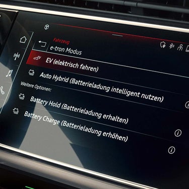 プラグインハイブリッドの特性を最大限に引き出す4つの走行モードを採用。モーターのみで駆動する「EVモード」、TFSIエンジンとモーターを組み合わせる「ハイブリッドモード」、回生ブレーキで得た電力によりモーターを駆動し充電残量を維持する「ホールドモード」、積極的にエンジンを作動させ回生により充電残量を増やす「チャージモード」、これらをインテリジェントに制御、または自身で好みやシーンに応じて切り替えることができます。