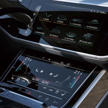 デジタル時代にふさわしいユーザーインターフェースであるMMIタッチレスポンスは、フラットな高解像度モニターで車両のセッティングやインフォテインメントを直感的に操作することが可能。グラフィックや振動、音によって、視覚、触覚、聴覚に明確な反応を感じ取れます。インフォテインメント用の10.1インチアッパースクリーンと、空調操作や手書き文字入力用の8.6インチローワースクリーンの2つのタッチディスプレイを搭載。イグニッションをOFFにするとスクリーンが漆黒のフラットなブラックパネルとなり、周囲のインテリアに溶け込みます。