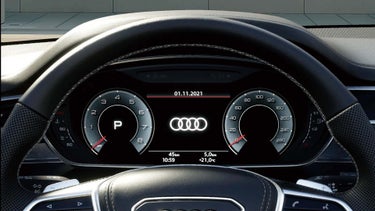 高解像度12.3インチカラー液晶フルデジタルディスプレイに、スピードメーター、タコメーター、マップ表示、ラジオ/メディア情報などフレキシブルに表示。操作はマルチファンクション付きステアリングホイールからダイレクトに行えます。レイアウトは「ダイナミック」、「スポーツ」、「Sパフォーマンス」から選択できます。またVIEWボタンを押すことでメーターの大小切り替えも可能。メーター表示を小さくすれば、オンボードコンピューターやMMIナビゲーションのコンテンツ、3D地形図などをより見やすく画面の広いエリアに表示できます。ルートガイダンスを起動している間は、スピードメーター近くにナビゲーション情報が常時表示され、タコメーターにオンボードコンピューター数値の配置も可能です。