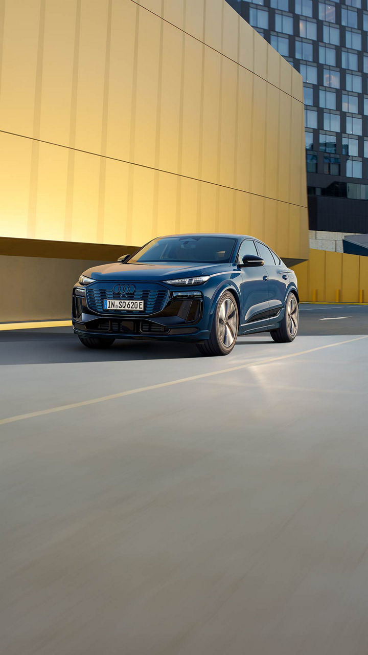 Audi SQ6 e-tronの力強い走りの源となるのは、車両前後に搭載する2基のモーター。システム最高出力380kW*¹(通常時360kW)、最大トルクはフロント275Nm/リヤ580Nmの動力性能の誇り、驚くほど静かな走行音とともに4.3秒*²で100km/hまで加速。後輪重視でトルクを配分する電動quattro®がしっかりと路面を捉え、走り出した直後から途切れのないリニアな加速を生み出します。