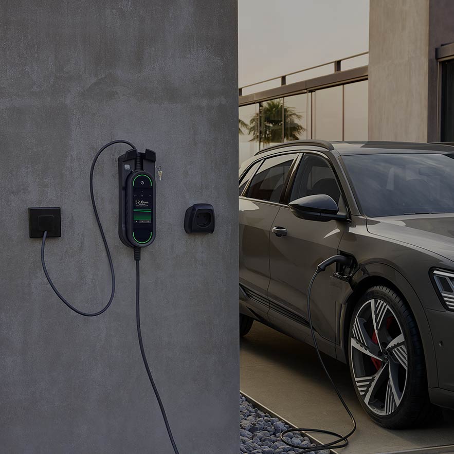 シンプルな操作で充電を可能にする普通充電用ユニット*。LEDライトで充電状態を確認できます。3kW充電用(標準装備)と、高出力な、ウォールブラケット付きの8kW充電用(写真/別売)をご用意。* 使用には別途充電設備工事が必要です。本ユニットは、急速充電にはご使用できません。