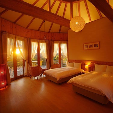 ツインタイプのスタンダードの客室。木のぬくもりを感じる心地よい空間で寛ぎのひとときをお過ごしいただけます。高さ5m以上の天窓から眺める星空は、天然のプラネタリウム。また朝は眩いばかりの朝日が差し込み、島の自然に包み込まれます。