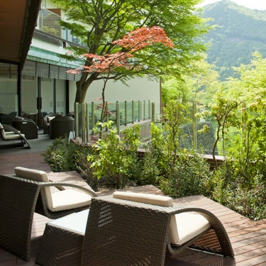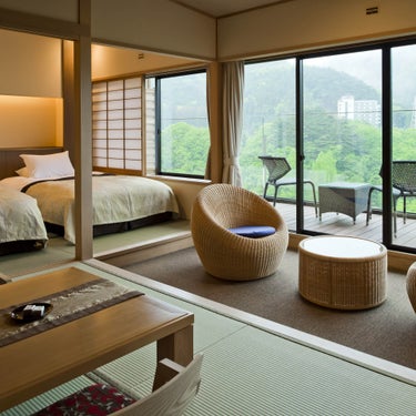 渓谷に面した窓を開けると、テラスから鬼怒川のせせらぎや豊かな自然をお楽しみいただけます。KANAYAスタイルの落ち着いた本間(12帖)と広縁(4帖)で心ゆくまでお寛ぎください。寝室には眠りの質を高めるセミダブルサイズのベッドを2台ご用意しております。