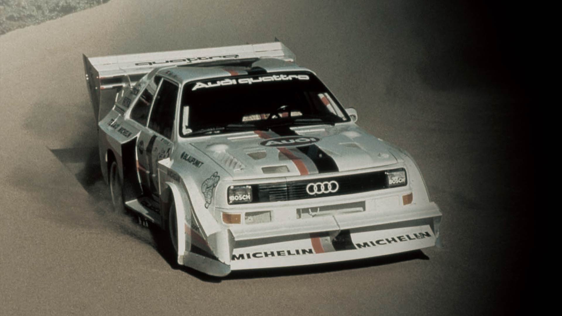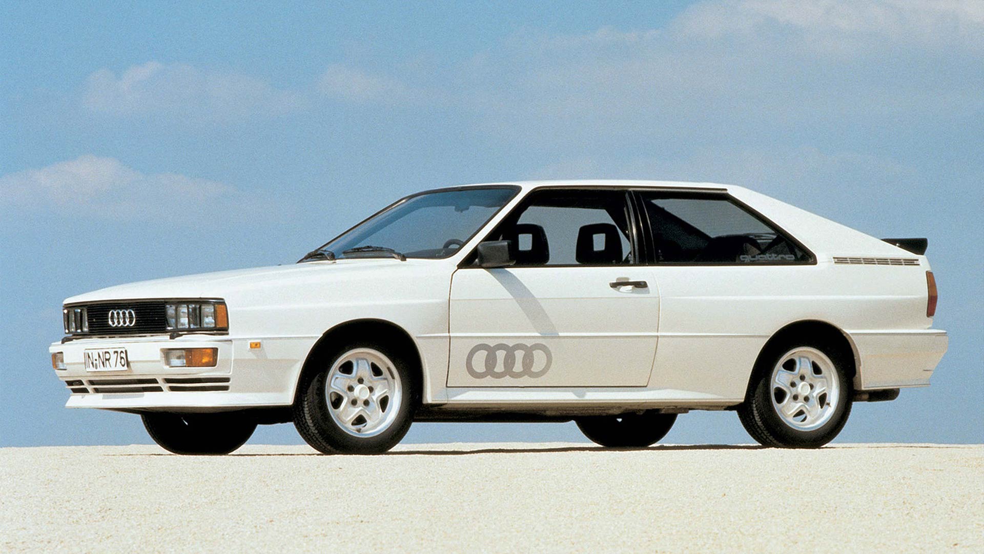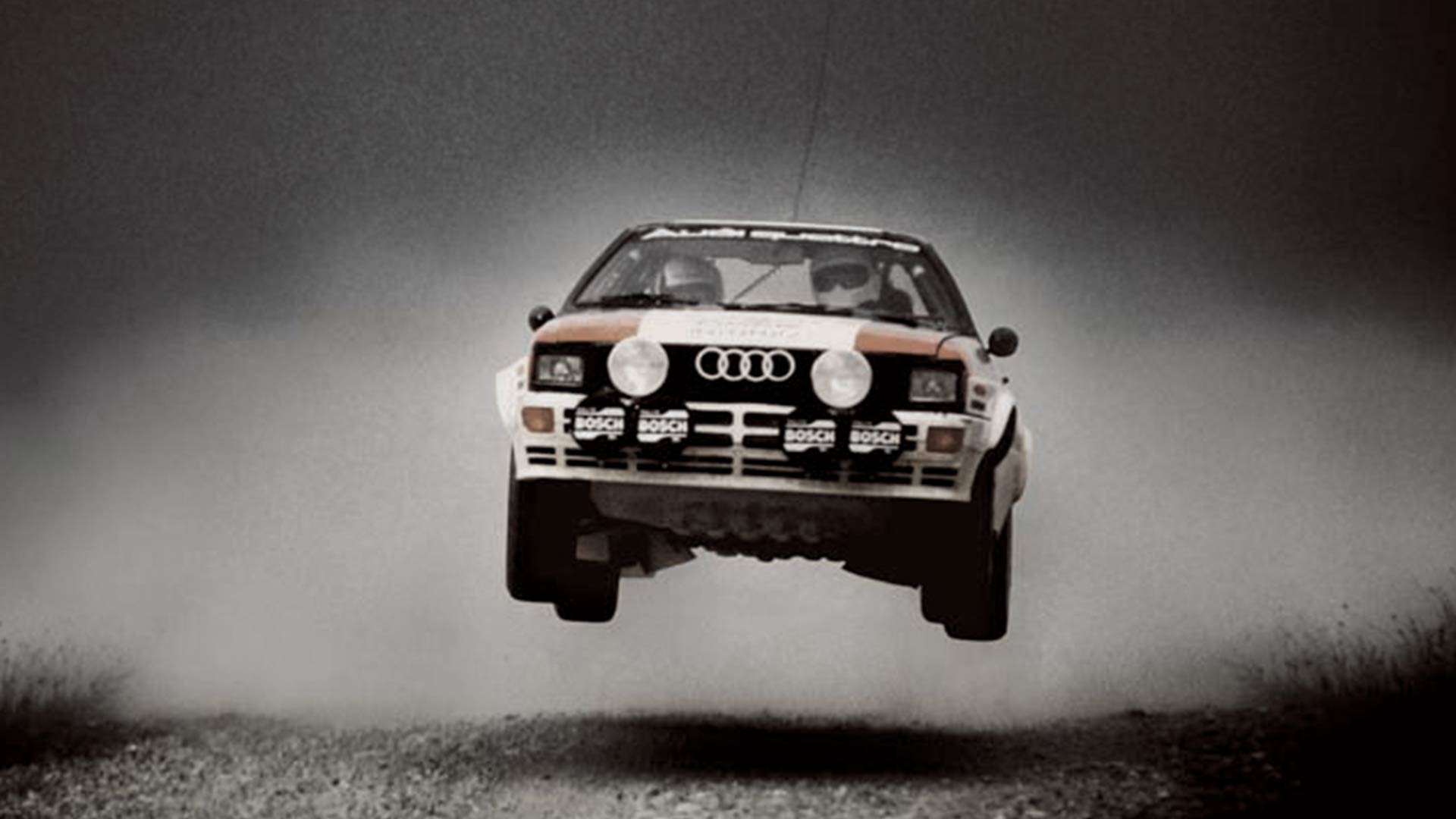 1980年3月。スイスのジュネーブで開かれたモーターショーに出展された1台のクルマに、世界中が衝撃を受けます。イタリア語で「4」を表す単語にちなんでAudi quattroと名付けられたそのクルマは、乗用車として初めてフルタイム4WDを採用。自動車の歴史に新たな1ページを刻みます。会期中、数台のAudi quattroが用意され、世界各国のジャーナリストがアルプス山中でテストドライブを敢行。その圧倒的な走破性と走行安定性を証明したAudi quattroは、世界中の自動車雑誌で絶賛されました。