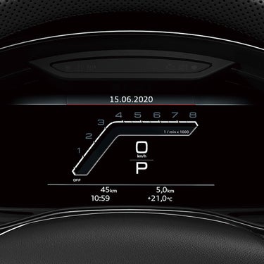 瞬時に情報を確認できる12.3インチの高解像度液晶画面を備えたバーチャルコックピットを採用。スピードメーター、タコメーター、地図、Audi connectサービスなどをフレキシブルに表示するほか、RSモデル専用の表示メニューでスピードメーターとタコメーターを中央に、パフォーマンスに関する情報を左右に配したレイアウトに変更することが可能です。車速やナビなどの情報と各種警告をフロントウィンドウ上に投影するヘッドアップディスプレイも搭載。