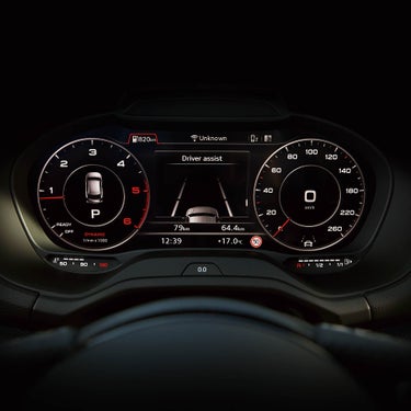 高解像度12.3インチカラー液晶フルデジタルディスプレイに、スピードメーター、タコメーター、マップ情報、Audi connectサービス、ラジオ/メディア情報をフレキシブルに表示。操作もマルチファンクション付きステアリングホイールでダイレクトに行えます。またVIEWボタンを押すことでメーター表示を小さくすれば、オンボードコンピューターやMMIナビゲーションのコンテンツ、3D地形図などをより見やすく画面の広いエリアに表示できます。運転中に必要な情報を目前に集約することで、視線移動を抑えドライビングの集中を妨げません。
