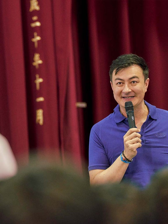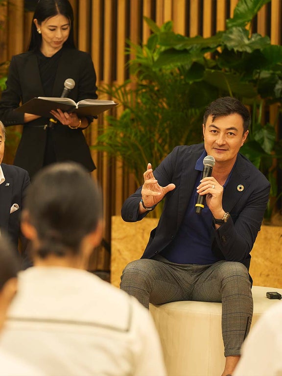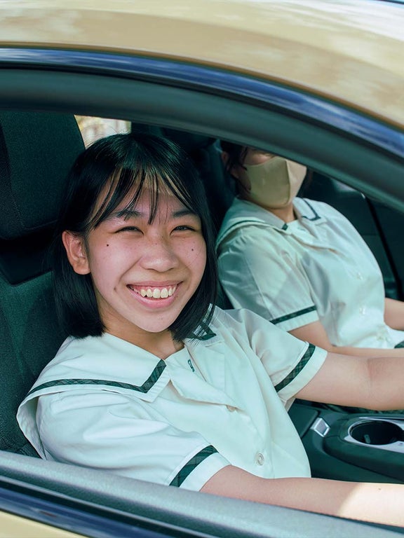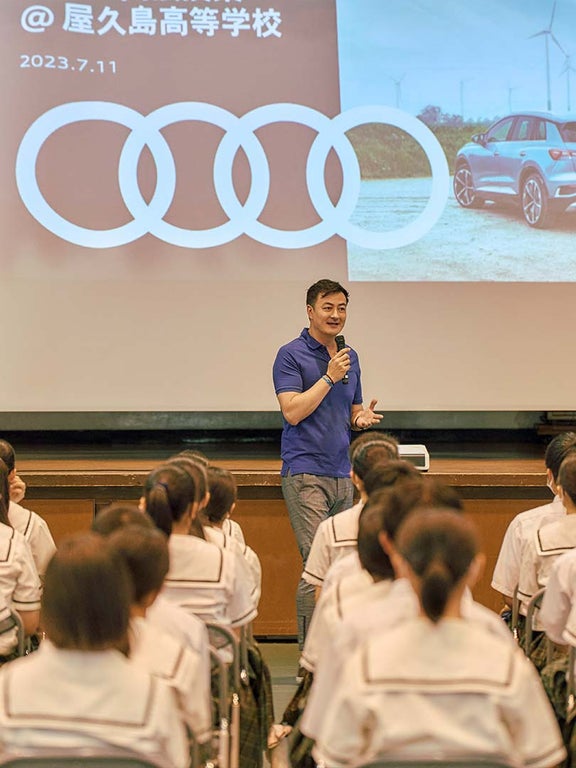 2日目の朝、島唯一の公立高校である鹿児島県立屋久島高等学校(以下、屋久島高校)にて、生徒約120名と電気自動車と再生可能エネルギーで目指す持続可能な未来について考える出張授業を行いました。カーボンニュートラルにおける先進的な取り組みを学んだ生徒からは「リーダーシップに必要な力とは何か」や「車がすべて電気自動車になるのはいつだと思いますか」など多くの質問があり、一人ひとりが未来について考え共有する場となりました。出張授業の最後には、e-tronに実際に触れる時間を設け、生徒たちは運転席や助手席に乗って、電気自動車を体感しました。脱炭素に一番近い島で生まれ育った子どもたちとの交流を通じて、屋久島の未来を共に考えることができました。ツアーの最後は「屋久島町役場」を訪問し「未来共創ミーティング」を開催