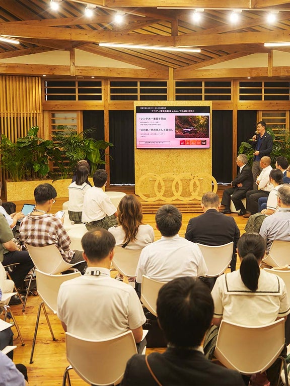 未来共創ミーティングではアウディジャパンが屋久島町、株式会社ファーレン九州と結んだ包括連携協定の取り組みの詳細を発表しました。島内に4か所7基の8kW普通充電器の設置、電気自動車e-tron専門のレンタカー事業の開始、屋久島町役場と屋久島電工に対するe-tronの長期貸与、屋久島の高校生に対する学習機会の提供など、多角的に屋久島と今後連携していくことを発表しました。