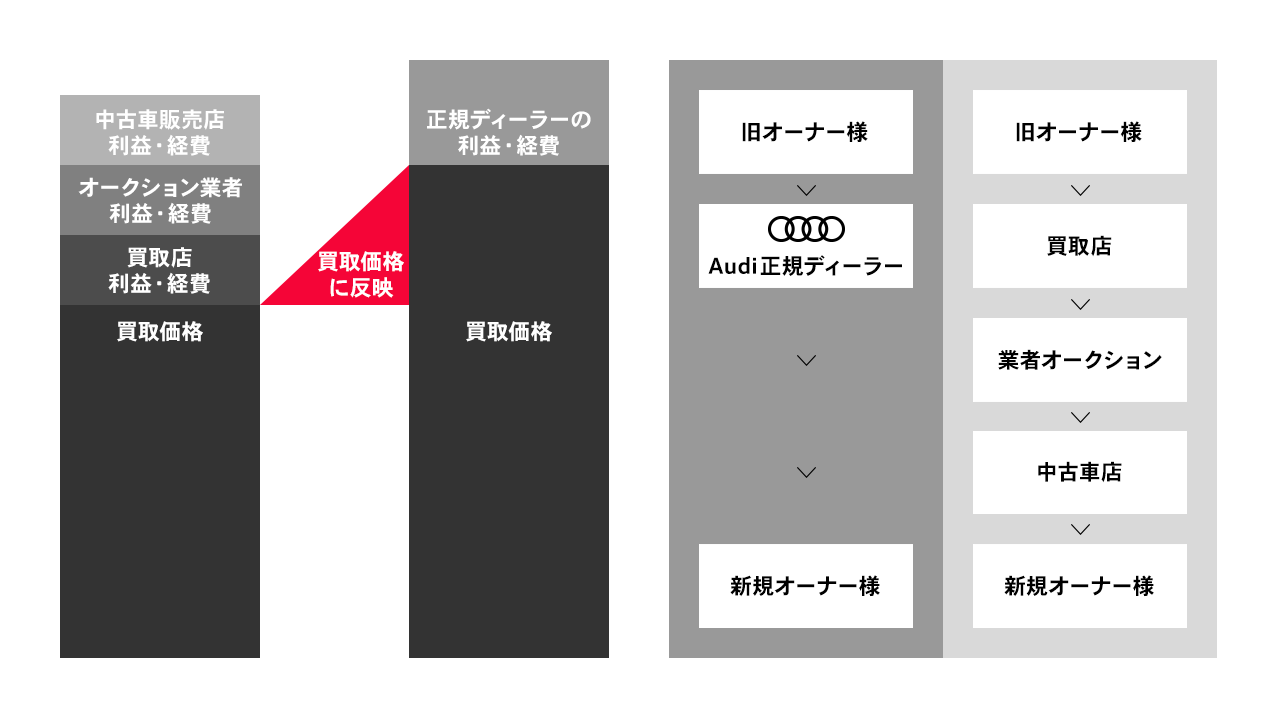 Audiを乗り継がない「買取」のお客様にもご満足いただくために、正規ディーラーならではの買取プログラムをご用意しております。お客様が愛されたAudi車の納得のいく売却をお考えなら、Audi正規ディーラーによる査定こそがベストな選択です。